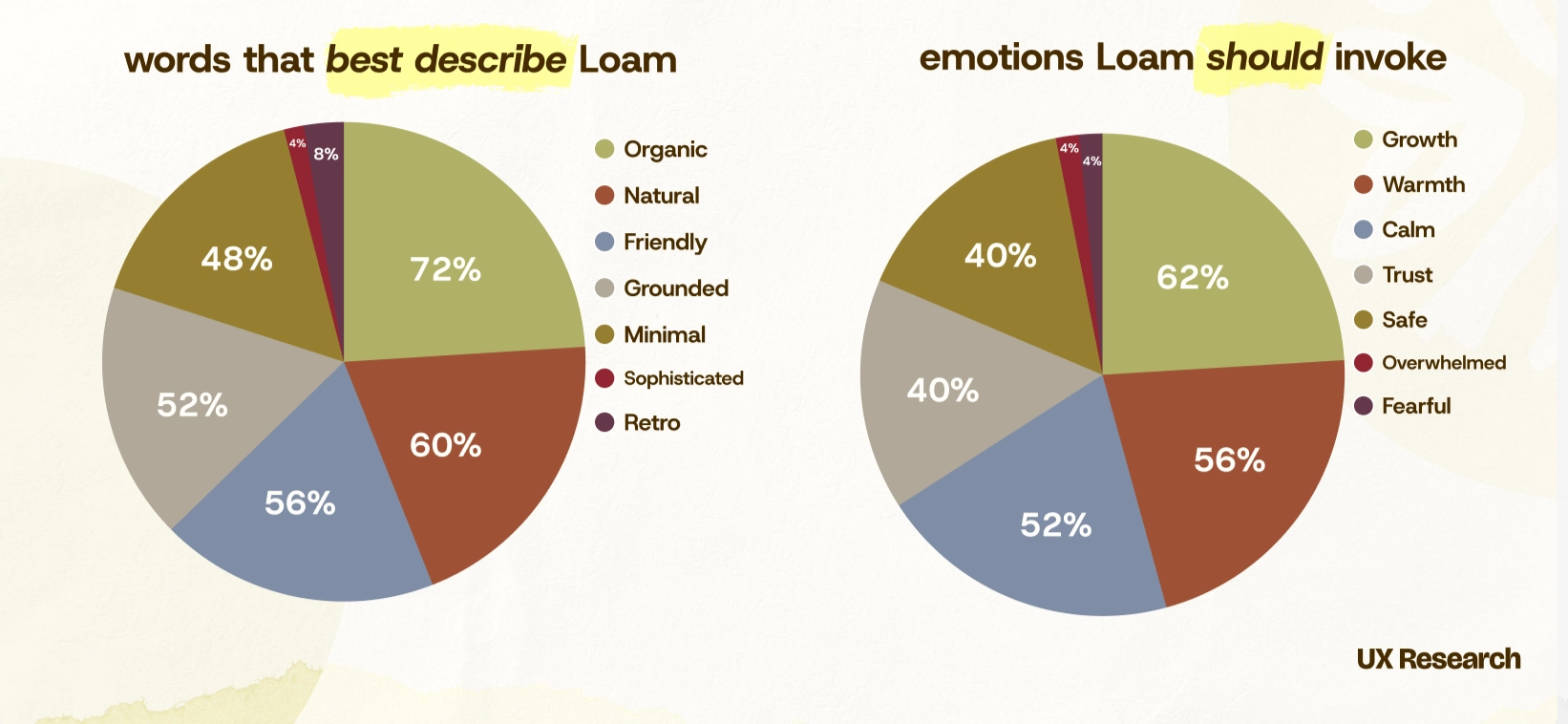 When user's think of loam, they think of Organic qualities that inspire Growth and WarmthThis informed both the logotype and the logomark. The final logotype uses hand-drawn letters characters to bring in a human touch, softened and bloated anchor points to create natural uneven curves, and an earthy color palette grounded in soil and nature. The logomark integrates leaf forms, root-like curves, and a non-perfect circular shape: a subtle abstract reference to L-O-A-M hidden across the top, grounded by the roots below.