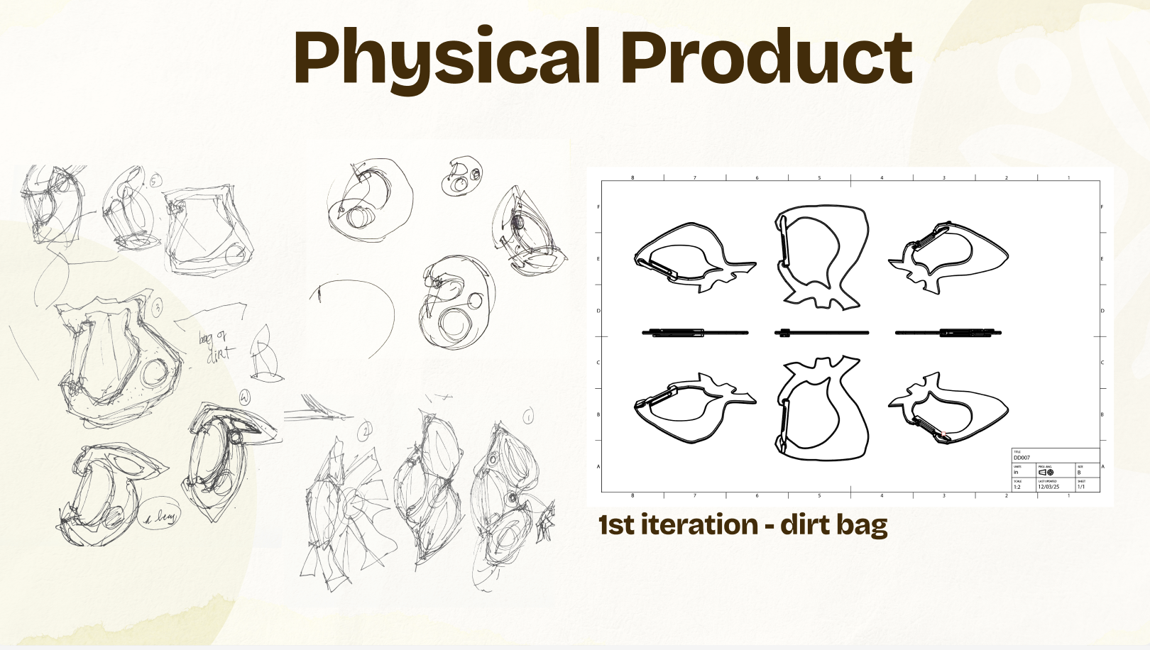 Our team studied how carabiners work mechanically and challenged ourselves to design one that is fully 3D-printed with no extra hardware. After testing several functional models, we moved into form exploration inspired by leaves, soil, and our lettermark. Landing on a bag of soil and a leaf shape as the first prototype forms.